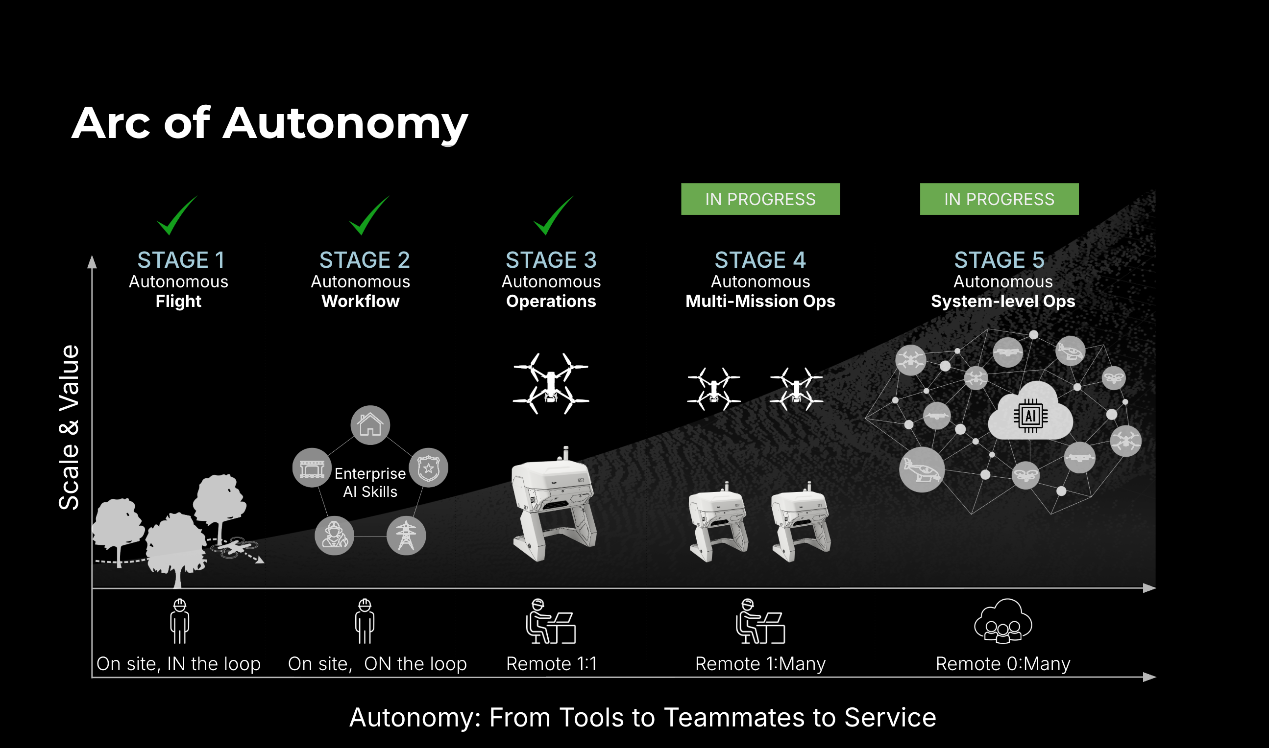 This evolution is what we call the Arc of Autonomy: the progression from a single operator with one drone (1:1), to one operator managing many drones (1:many), and ultimately to fleets of drones operating autonomously (many: many) with remote operator oversight. We believe the stage is set for drones to become a critical component in managing large-scale infrastructure, including power, water, and roadways.
