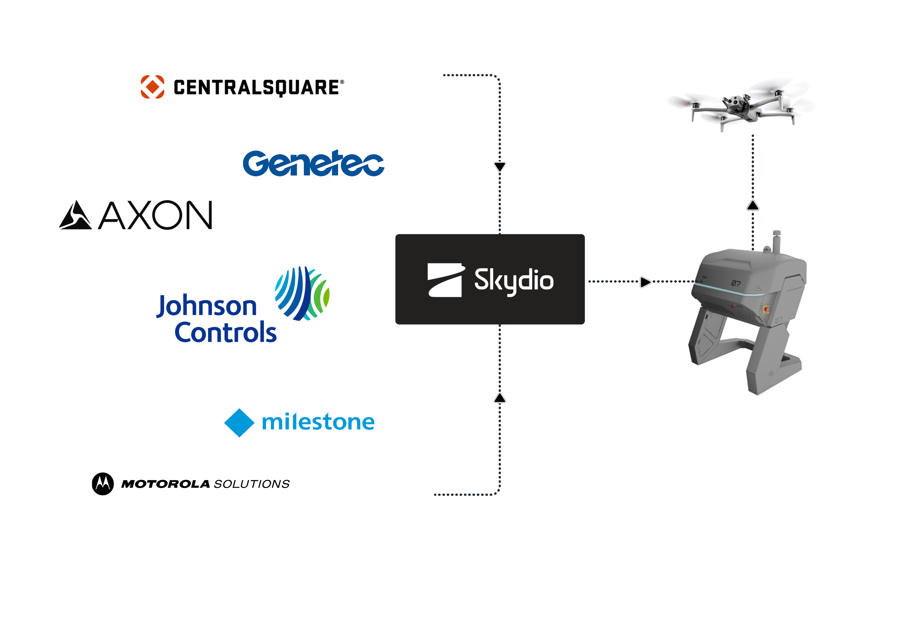 Skydio connects to the platforms you already trust. Integrate video streams into Axon Fusus, Axon Evidence, Genetec, Milestone, or your facility’s existing VMS. Flights can be triggered by alarms or access-control events, including those from Johnson Controls. Integrate real-time detection tools to ensure you don’t miss a threat, and rely on open APIs for flexible interoperability.